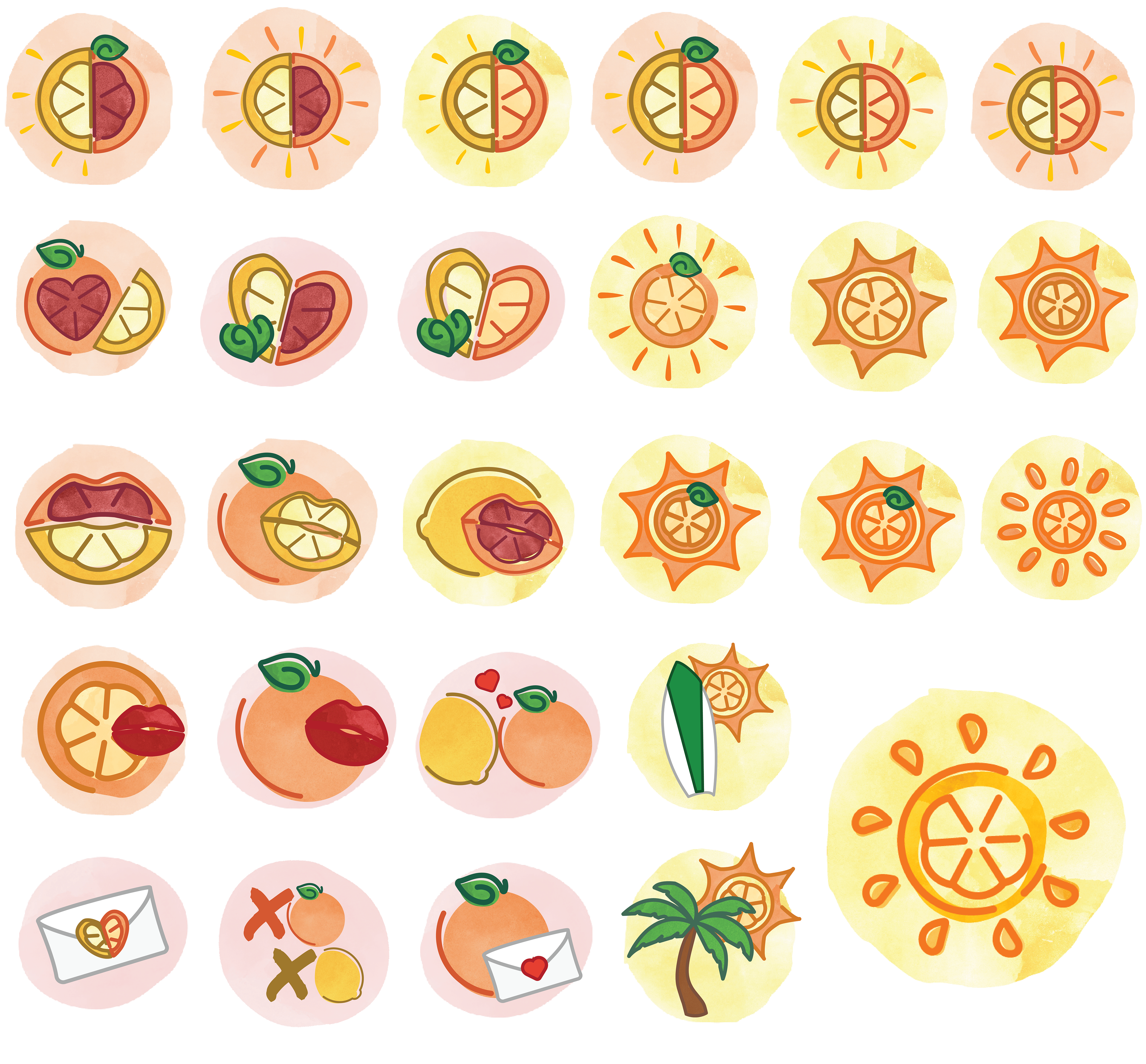 Initially starting with just visually combining Lemon and Blood Orange -> Representing 'Kissed' with lips, love, hearts -> Leaning into Summer and focusing on the Sun -> Using a Citrus based Sun to represent 'Sun-kissed' and the flavors. Success!